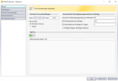 Bei Server-Start können Sie festlegen, wie der Spooler-Dienst in ihrem System ausgeführt werden soll. Im Regelfall handelt es sich um einen Windows-Service. Benötigen Sie allerdings einen "interaktiven" Server-Start, muss hier Direkt ausgewählt sein (siehe dazu auch entsprechende Hinweise zur Installation).