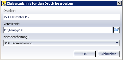 So können Sie z.B. ein Verzeichnis angeben, in das alle mit dem ISD FilePrinter PS konvertierten PDFs abgelegt werden, und ein anderes, in das mit einem anderen Dienst ausgeschriebene Dateien abgelegt werden.