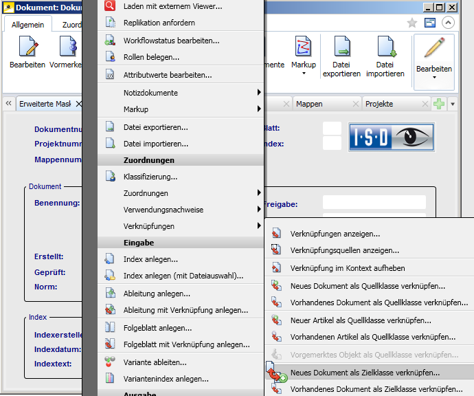 Klicken Sie dafür in der Detailmaske des entsprechenden Dokuments (der CAD-Konstruktion) auf RMT > Verknüpfungen > Neues Dokument als Zielklasse verknüpfen.