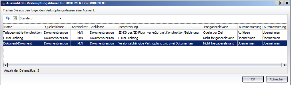 Nach Anwahl öffnet sich das Fenster für die Auswahl des Verknüpfungstyps, danach die Dokumentsuche zur Auswahl des als Quellklasse zu verknüpfenden Dokuments. |