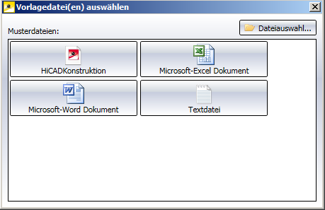 Ein neues Dokument wird als Quellklasse mit dem aktiven Objekt verknüpft. Es öffnet sich zunächst der Auswahldialog für den Verknüpfungstyp, dann der für die Datei (hier ist für den Dateityp entweder eine der angebotenen Musterdateien des Auswahldialogs auszuwählen, oder über Dateiauswahl eine spezifische Datei aus dem lokalen System), und schlussendlich der Dokumenteingabe-Dialog. |