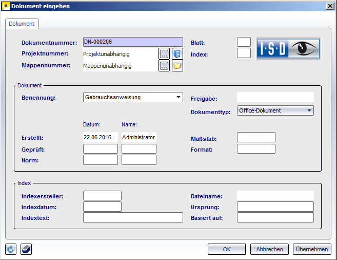 Als nächstes erscheint die Dokument-Eingabemaske für das Zieldokument. Dort können Sie Angaben wie z.B. eine eindeutige Benennung machen, Bestätigen Sie die Eingabe mit OK.