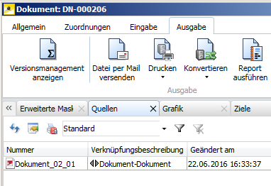 Danach wird die Dokument-Detailmaske der neu angelegten Gebrauchsanweisung geöffnet. Im Reiter Quellen wird das Dokument der CAD-Konstruktion als Verknüpfungsquelle aufgeführt (genauso wie in der Detailmaske des CAD-Dokuments die Gebrauchsanweisung im Reiter Ziele aufgelistet wird).