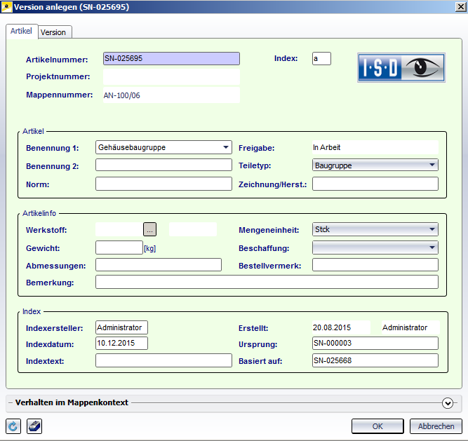 Im folgenden Dialogfenster Version anlegen, das die Tabs Artikel (analog der Artikel-Eingabemaske) und Index kombiniert.