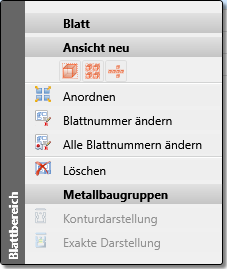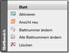 In diesem Fall lässt sich der Blattbereich aktivieren, indem Sie im ICN auf eine Ansichten klicken. Der Name des Blattbereiches wird unterstrichen und fett dargestellt. Wenn Sie jetzt mit der rechten Maustaste auf den Namen dieses Blattbereiches klicken, wird das folgende Kontextmenü angezeigt: