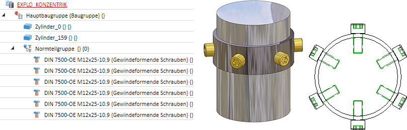 Die nächste Abbildung zeigt eine Explosionsansicht, bei der für die Konzentrik ebenfalls die einzelnen Schrauben ausgewählt. Allerdings wurde hier als Achse die X-Achse gewählt, die in diesem Fall kein sinnvolles Zentrum darstellt.Hätte man hier die Normteilgruppe gewählt, dann entspricht dies einer "normalen" Verschiebung.
