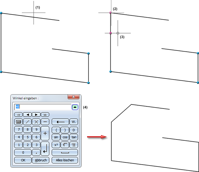 Während der Wahl des Eckpunktes bzw. des Schenkelanfangs ist es über das Kontextmenü möglich, in den jeweiligen vorherigen Auswahlschritt zurückzukehren. Bei der Eingabe des Winkels geschieht dies durch die Eingabe eines leeren Winkels.