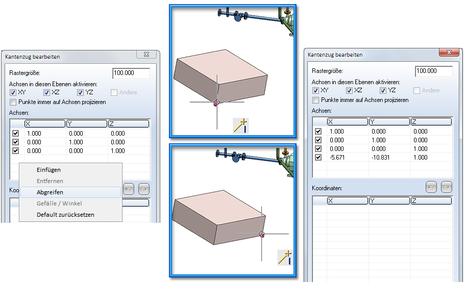 Zeigen Sie mit dem Mauszeiger unter die letzte Zeile der Achsentabelle. Mit einem Rechtsklick erhalten Sie ein Kontextmenü; wählen Sie darin Abgreifen. Im Aufstellungsplan identifizieren Sie dann die beiden Punkte, die die Achsrichtung festlegen sollen. Die entsprechenden X,Y und Z-Werte werden dann automatisch in die Achsentabelle eingetragen.