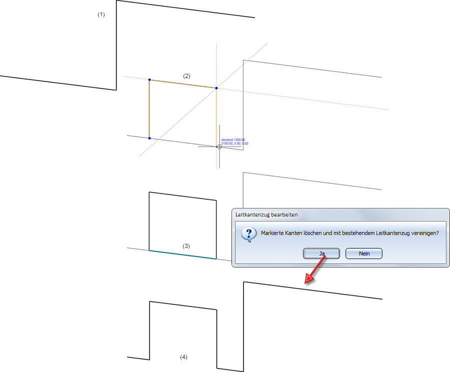 (1) Existierender Leitkantenzug, (2) Neuer Leitkantenzug , (3) Bestätigung mit Ja, (4) Modifizierter Leitkantenzug