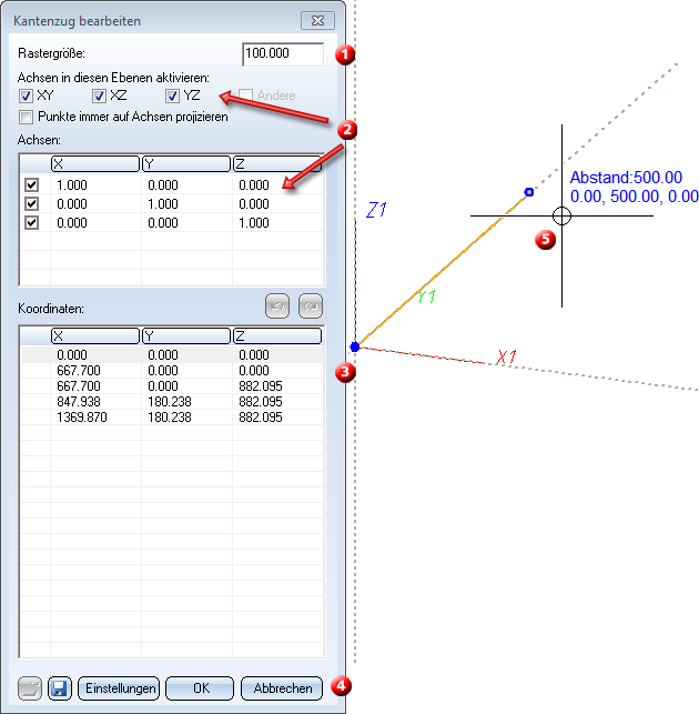 Die Koordinatentabelle dient zur Anzeige und Eingabe der Koordinaten der Kantenzugpunkte. Die Koordinaten beziehen sich auf das in der Szene aktive Koordinatensystem (Weltkoordinatensystem oder lokales Koordinatensystem). Zunächst ist der Ursprung des Koordinatensystems als erster Punkt vorgeschlagen. - Schaltflächen