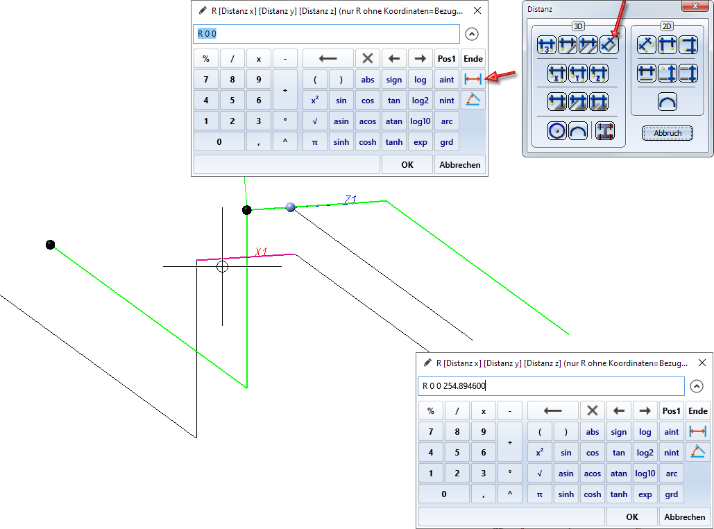 Legen Sie den Zielpunkt relativ zum Anfangspunkt der Diagonalen fest. Wählen Sie dazu die Punktoption Relativ (R auf der Tastatur), drücken Sie die ENTER-Taste und wählen Sie den Anfangspunkt der Diagonalen. Geben Sie dann für die x- und y-Distanz den Wert 0 ein. Die z-Distanz wollen wir aus der Ausgangsrohrleitung übernehmen. Daher klicken wir im Taschenrechner auf