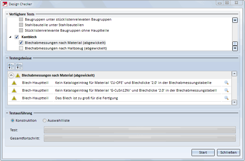 Geprüft werden entweder die aktive Konstruktion oder alle Baugruppen der Auswahlliste. Dazu aktivieren Sie einfach die gewünschte Option unter Testausführung. Solange das Dialogfenster geöffnet ist, können Sie die Auswahlliste, die geprüft werden soll, beliebig wechseln.