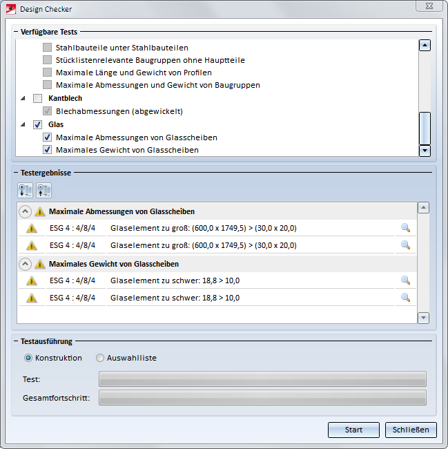 wird geprüft, ob die Abmessungen und das Gewicht von Glasscheiben, die im Konfigurationseditor unter Analyse > DesignChecker > Max. Abmesssungen und Gewicht von Glasscheiben festgelegten Maximalwerte überschreiten.