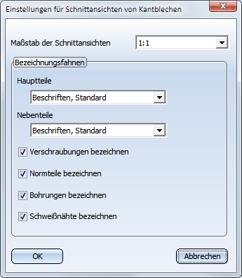 Über die Checkboxen unten im Dialogfenster können Sie festlegen, ob Verschraubungen, Normteile, Bohrungen und Schweißnähte in den Schntitansichten beschriftet werden sollen oder nicht.