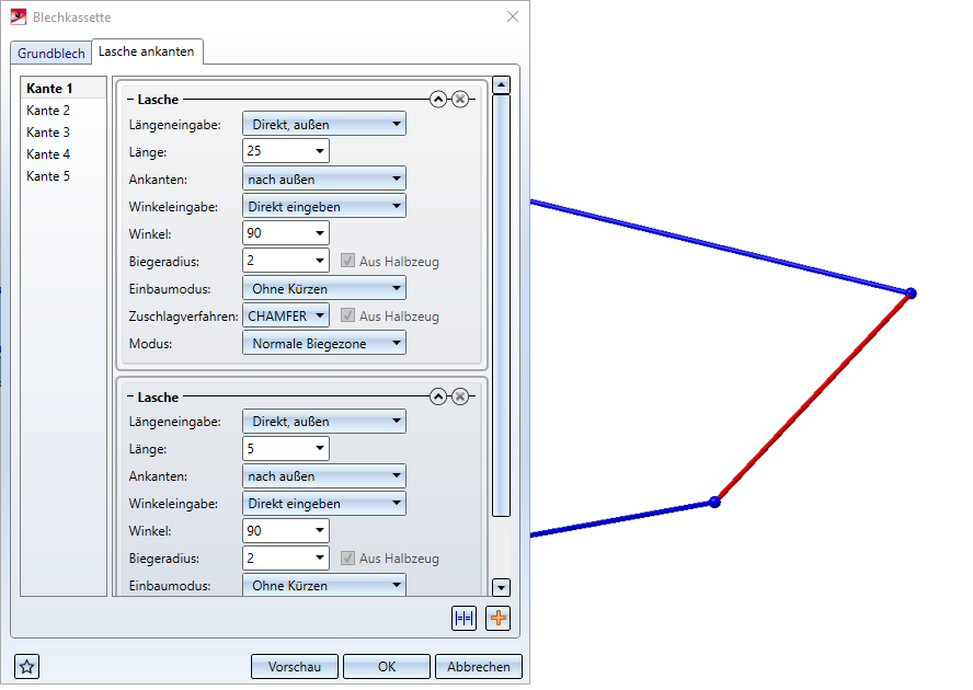 Auf der Registerkarte Lasche ankanten stehen links die nummerierten Kanten, die die auf der Registerkarte Grundblech, angelegten Punkte verbinden. Die aktive Kante wird in der Konstruktion farblich hervorgehoben. Mit dem Plus-Icon