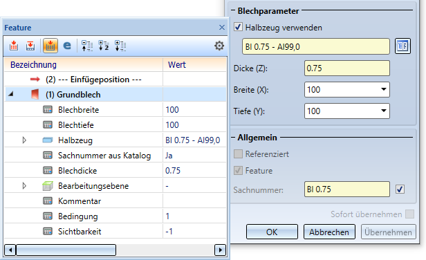 Ist die Option Sofort übernehmen aktiv, wird das neue Blech bei einer sinnvollen Eingabe sofort eingebaut und kann dann über das Featureprotokoll geändert werden.