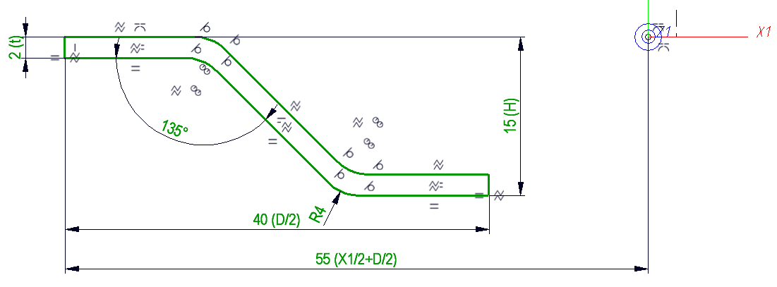 Durch die Lagebedingungen ist die Skizze komplett definiert. Die verwendeten Variablen haben dabei folgende Bedeutung: t steht für die Dicke des zu bearbeitenden Blechs. h steht für die Höhe der Sicke, d für die Breite.