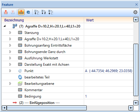 Die Musterbohrung wird in das Featureprotokoll des Blechteils eingetragen und kann mit einem Doppelklick auf den Eintrag z.B. Agraffe geändert werden.