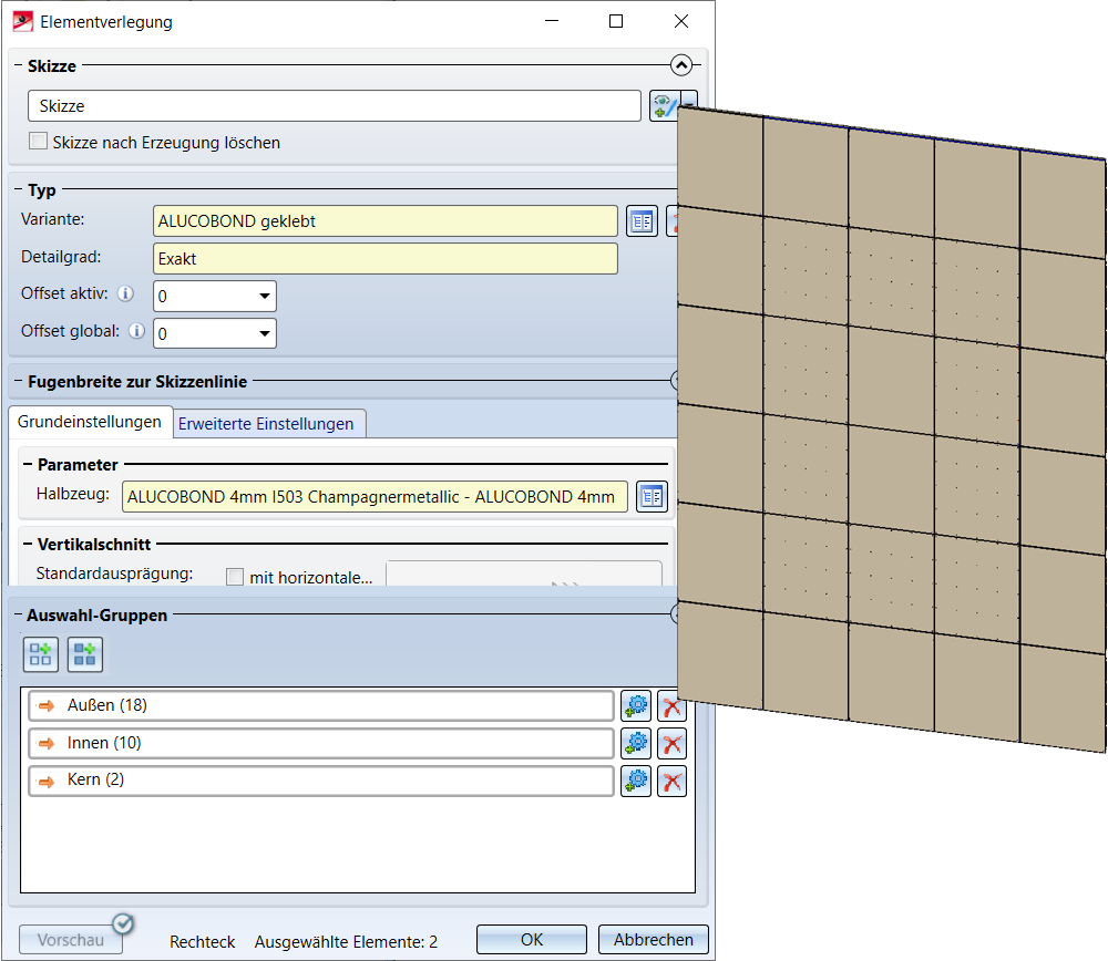 Ohne das Dialogfenster zu verlassen, definieren wir dann analog eine weitere Gruppe, z.B. Innen für die grün markierten Bereiche und belegen diese anschließend mit genieteten ALUCOBOND Kassetten.