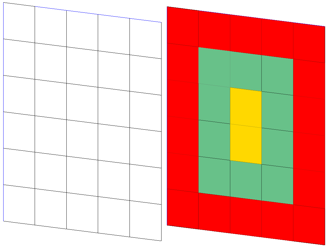 Die folgende Abbildung zeigt links die Skizze für die Elementverlegung. Nehmen wir an, dass - wie rechts farbig dargestellt - auf den Bereichen mit derselben Farbe die Verlegeelemente jeweils die gleichen Parameter haben. In diesem Fall bietet sich der Einsatz von Auswahlgruppen an.