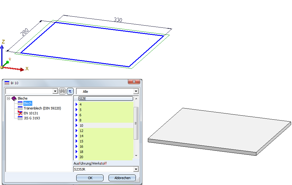 ein Rechteck der Größe 330 x 280 (Länge x Höhe) auf. - Leiten Sie aus der Skizze mit der Funktion Stahlbau > Blech neu > a.Skizz...