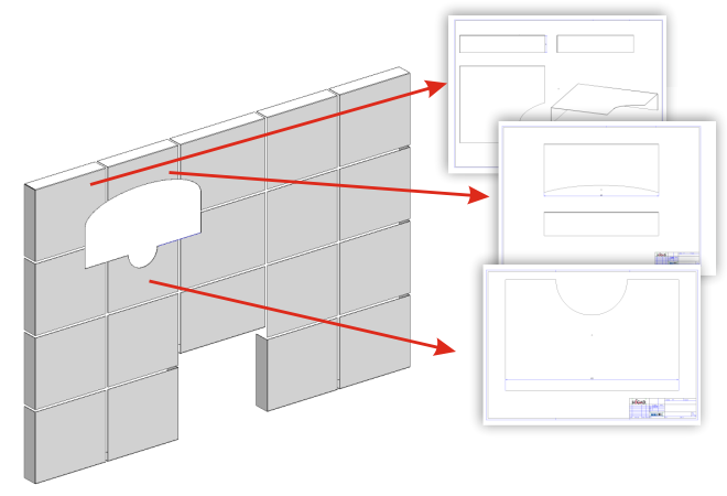 Dies kann zum Beispiel nützlich sein, wenn Sie Modifikationen an den Elementen der Elementverlegung vorgenommen haben, wie z.B. weitere Bohrungen oder Ausnehmungen. Dann kann es nötig sein, zu diesen Elementen einzelne Zeichnungen anzufertigen, um die Teile fertigen zu können. Bei großen Elementverlegungen können hiervon viele Elemente betroffen sein, was einen großen Zeitaufwand für die Erzeugung und Anpassung der einzelnen Zeichnungen nach sich ziehen würde.