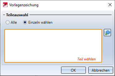 Hier haben Sie bei Teileauswahl die Wahl, ob sie Zeichnungen zu allen Elementen der aktiven Profilverlegung erzeugen wollen (Alle) oder nur zu bestimmten Teilen (Einzeln wählen). Wenn Sie sich hier für Einzeln wählen entscheiden, können Sie anschließend in der Konstruktion die zu wählenden Teile durch Anklicken mit der linken Maustaste an- und wieder abwählen.