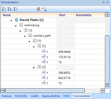 - Beim aktiven Teil werden die Schnittpunkte als Teilevariablen gespeichert. Dazu wird eine Listenvariable verwendet, die entsprechend dem Namen in den Verbindungsparametern benannt wird.