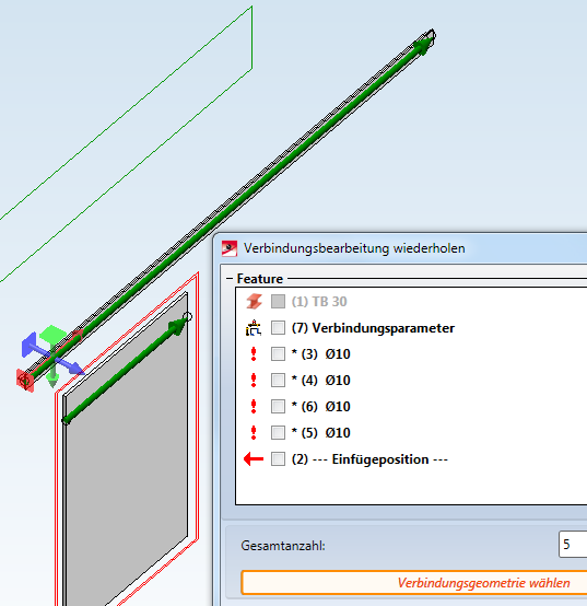 Verbindungsgeometrie wählen werden in der Konstruktion alle Verbindungsgeometrien durch grüne Pfeile hervorgehoben. Wählen Sie die gewünschte Verbindungsgeometrie durch einen Klick mit der linken Maustaste aus.