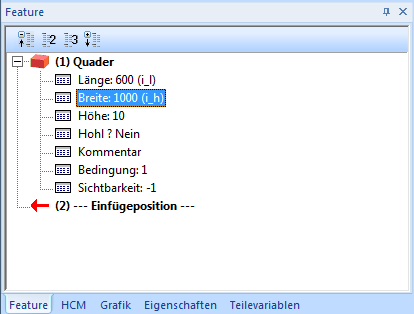 - Wählen Sie den Quader aus. Im Bereich Feature des ICN finden Sie den Feature-Eintrag Quader. Klappen Sie diesen auf. Doppelklicken Sie auf den Eintrag Länge: 600 und geben Sie in das erscheinende Fenster