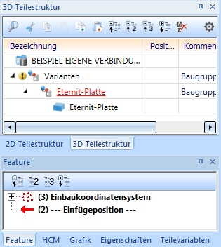 - Wählen Sie die Baugruppe Eternit-Platte aus. Diese hat noch kein Feature-Protokoll, weshalb dieses zunächst aktiviert werden muss: Klicken Sie hierzu mit der rechten Maustaste in den leeren Bereich der Registerkarte Feature im ICN und wählen dann den Punkt Feature einschalten aus.