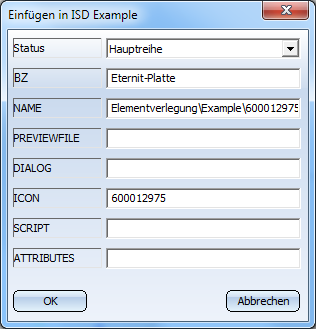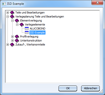 - Als Datenverzeichnis wählen Sie Werksnormen\Elementverlegung\Example aus, als Katalog Verlegeplanung Teile und Bearbeitungen\Elementverlegung\Verlegeelemente\ISD Example. Die dann erscheinenden Einstellungen können unverändert übernommen werden; ein Bitmap muss hier nicht erzeugt werden.