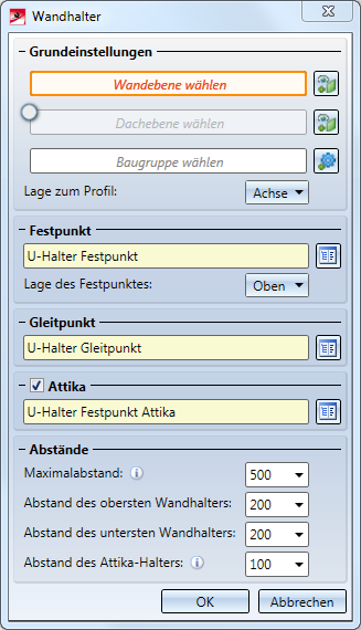 Nach Aufruf der Funktion wird das Dialogfenster Wandhalter angezeigt: