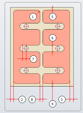 (2), (3), (4) und (5) sind die Abstandswerte des Futterblechs zu den Außenkanten der Platte, (6) sozusagen der Durchmesserwert der Lücken, (7) der Abstand der inneren Rundung zur Bohrungsreihe des Rasters und (8) der Abstand den beiden Futterblechhälften zueinander.