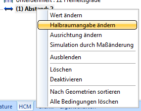 Voreingestellt ist hier, dass der Halbraum „unwichtig“ ist, d.h. der HCM 3D versucht, den augenblicklichen Zustand beizubehalten. Probleme können sich dann ergeben, wenn Bedingungen per Makro oder im Zusammenhang mit der Feature-Technik automatisch definiert werden und z.B. ein Punkt durch eine vorherige Transformation auf der anderen Seite der Ebene zu liegen gekommen ist. In diesem Fall wird der Abstand i.a. auch auf dieser „anderen“ Seite gemessen, und das Ergebnis fällt eventuell nicht wie gewünscht aus. Dies können Sie unterbinden, wenn Sie neben der Abstandsbedingung auch eine Halbraum-Angabe definieren.