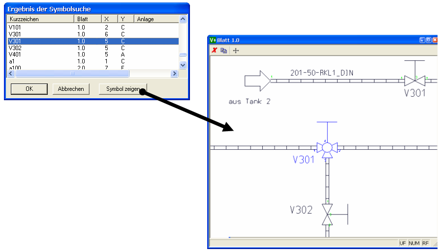 Bei allen drei Funktionen gelangt man zu einer Ergebnisliste, in der man die Zeile eines Symbols markieren kann. Mit einem Klick auf Symbol zeigen wird das Blatt, auf dem sich das ausgewählte Symbol befindet, im Viewer gezeigt. Dabei wird in einen Ausschnitt gezoomt, der das Symbol selbst und seine nähere Umgebung umfasst. Das Symbol wird grafisch hervorgehoben.