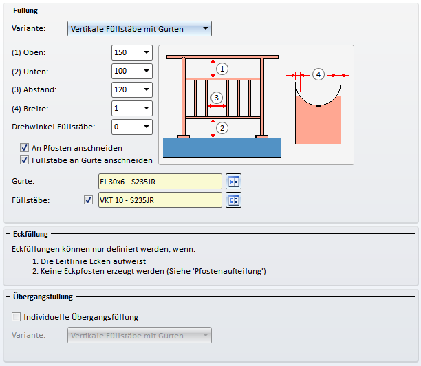 1. Die Parameter des Geländers aus Schritt 2 sind im Dialogfenster des Geländerkonfigurators noch eingestellt. Wir müssen nur die Einstellungen unter Pfostenaufteilung ändern.
