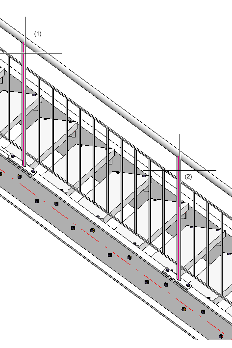 Wir beginnen die Geländererzeugung in unserem Beispiel mit der linken Wange der 2. Treppe. Diese Treppe hat den kürzesten Lauf. Der Pfostenabstand des entsprechenden Geländers soll als Abstand für alle anderen Geländer verwendet werden. Ist das erste Geländer erzeugt, dann lassen sich anhand dieser Daten alle anderen Geländer ganz leicht ableiten.