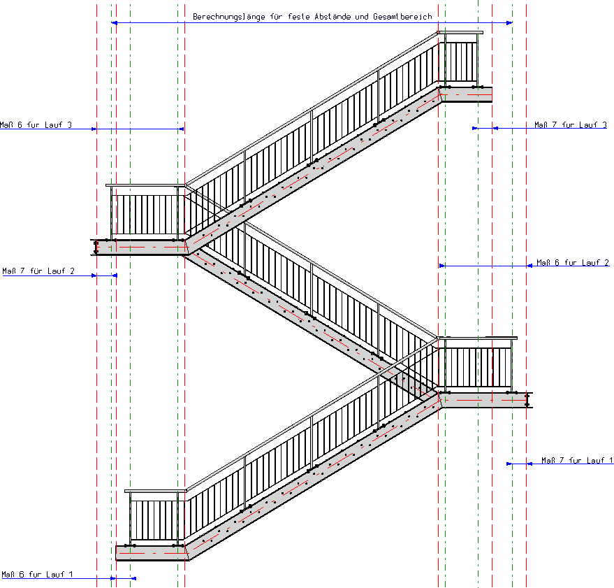 Unser Beispiel besteht aus drei 3 Treppenabschnitten (Lauf 1 bis 3). Für jeden Lauf wird das Geländer separat für die linke und rechte Treppenwange erzeugt, Die Geländererzeugung in unserem Beispiel besteht also aus 6 Schritten.