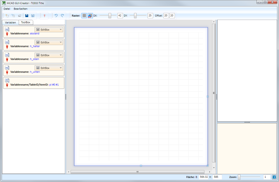 Nachdem wir im ersten Schritt die Beispielvariante einer ebenen Füllung erstellt, gespeichert und automatisch den HiCAD Dialogeditor gestartet haben, können wir jetzt im zweiten Schritt unseren Dialog erstellen.
