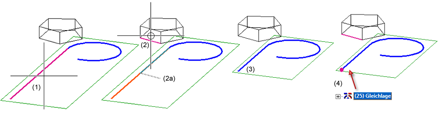 (1) gewählte Linie, (2) gewählte Kante (verwendet wird die Projektion 2a), (3) verkürzte Linie, (4) Gleichlagenbedingungen zwischen Punkt und Kante