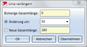 Im Feld Bisherige Gesamtlänge wird dann die aktuelle Länge dieser Linie angezeigt. Durch Aktivierung der Option Änderung um oder neue Gesamtlänge und anschließende Eingabe des gewünschten Wertes legen Sie dann die Art der Verlängerung/Verkürzung fest.