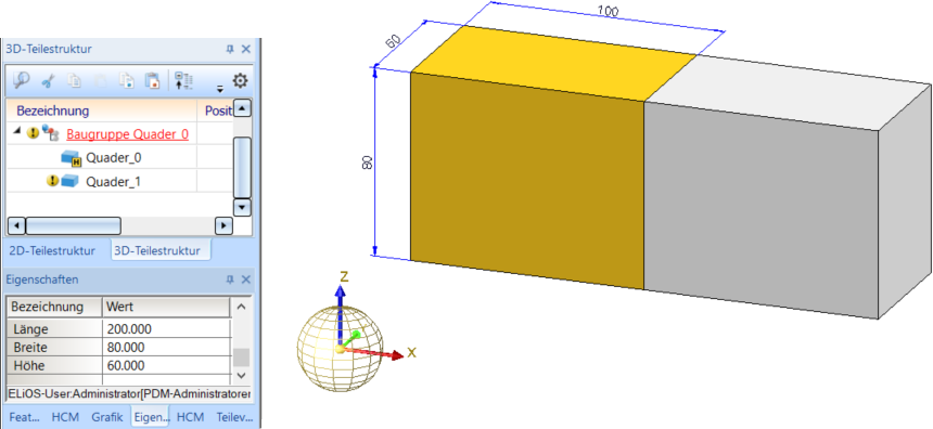 Wandelt man jetzt den 2. Quader in ein Baugruppenhauptteil um, dann wird die Hauptteilkennung des 1. Quaders aufgehoben und die Baugruppenabmessungen ändern sich.