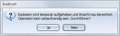 - In einer Explosionsansicht können auch Ausbrüche erzeugt und editiert werden. Dazu wird die Explosion temporär aufgehoben. In diesem Fall wird eine entsprechende Meldung angezeigt, mit der Möglichkeit, den Vorgang auch abzubrechen:
