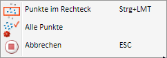 Punkte im Rechteck (STRG + LMT) Mit dieser Funktion lassen sich die Punktnummern aller innerhalb eines Rechtecks liegendenPunktelöschen. Dazu bestimmen Sie mit der linken Maustaste einen Eckpunkt des Rechtecks und ziehen dann ohne die linke Maustaste loszulassen das Rechteck auf. Die jeweils ausgewählten Punkte werden beim Aufziehen des Rechtecks farbig markiert.Wenn Sie dann die Maustaste loslassen werden die Punktnummern dieser Punkte gelöscht. Diese Funktion können Sie auch über die Tastatur aufrufen. Dazu gehen Sie wie folgt vor: