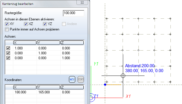 Der Achsenursprung für die grafische Eingabe des nächsten Kantenzugpunktes wird in den vorhergehenden Kantenzugpunkt gelegt.