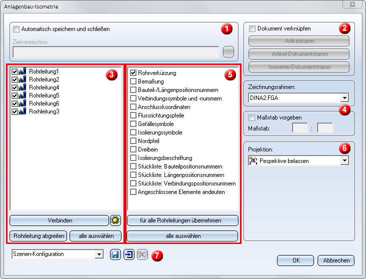 . - Die Voreinstellungen im Dialogfenster werden durch die Einstellungen im Konfigurationsmanagement unter ...> Anlagenbau > Isometrie und Rohrplan beeinflusst.