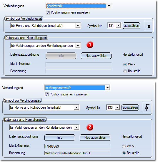 Verbindungsart - Zuordnung von Datensatz und Herstellungsort: (1) noch keine Zuordnung, (2) Zuordnung vorhanden