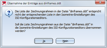 Mit Ja wird die Liste aus der Datei dinframes.ddt in die Einstellungen des ISD-Konfigurationsmanagements übernommen. Mit Nein wird die Übernahme übersprungen. Wenn Sie dauerhaft keine Übernahme wünschen, dann löschen Sie die Datei dinframes.ddt!.