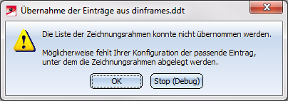 Die Übernahme der Liste ist nur dann erfolgreich, wenn im ISD-Konfigurationsmanagement unter Zeichnungsrahmen ein entsprechender Eintrag vorhanden ist. Falls nicht, z.B. weil nach einem Update eine ältere Konfiguration verwendet wird, erscheint die folgende Meldung: